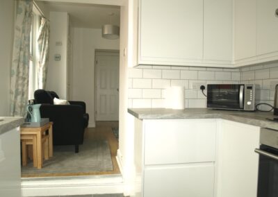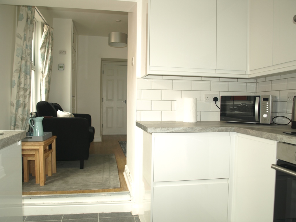 Kitchen: 8’9 x 6’8 Double glazed door with access to garden, double glazed window to side, range of wall and base units, stainless steel sink with mixer taps, stainless steel oven and hob, fridge freezer, door to: